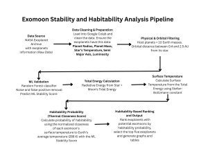 Figure 1 shows the Exomoon Habitability Analysis Pipeline. It shows the step by step procedure of the research analysis, from getting data from NASA Exoplanet Archive to the final ranking of habitable exomoons using Python and ML.