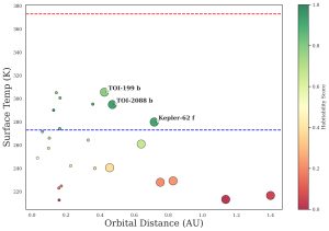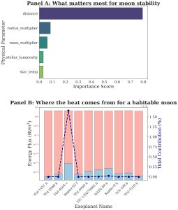 Figure 3 shows the relationship between the calculated thermal results and the predicted orbital stability. The habitability score (green means it is close to Earth’s 288 K) finds exoplanets that can have exomoons with Earth like climates. The size of the dots indicates the ML stability score. This helps filter for exoplanets that can potentially keep their moon in a steady orbit over millions of years. The exoplanets with high habitability sources and high ML stability are labeled on the figure. These are the rare places where it is warm enough for liquid water to exist and also safe enough for the moon to stay in its orbit.