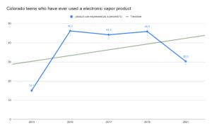 Pubmed and Google Scholar were searched with the keywords: “addiction”, “adolescent”, “Colorado”, “e-cigarette”, “marijuana”,“nicotine”, “teen”,“vaping”,“weed” in different combinations to find literature that reported on trends of e-cigarette use in adolescents.