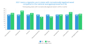 It is clear that within the last decade, e-cigarette use in teens has increased substantially nationwide from 3 to 27% in 4 years.(8). E-cigarette retail sales increased nationwide from 667 to 1547 per 100,000 between 2012-2016(10). Specifically, states with recreationally legalized marijuana have higher teen e-cigarette use than states without recreationally legalized marijuana(6). Data from the YRBS supports this conclusion as states that have had marijuana legalized for over 7 years have a higher e-cigarette use than the national average (2% increase for recreationally legalized marijuana). When focusing on Colorado specifically, we can see an increase of 4.1% higher than the national average(11). Looking at longitudinal trends in Colorado, we can see an approximately 100% increase in teen e-cigarettes following the legalization of marijuana between late 2012 to 2021(12). This issue is not state specific; California, another weed-legal state, has also demonstrated increased e-cigarette use between 2014-2018(55.5%) and also sits higher than the national average(6%) in 2021(9).