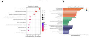 Gene Ontology (GO) enrichment analysis identified several significant pathways across different categories. For Biological Processes, the enriched pathways included acute inflammatory response, detoxification, regulation of carbohydrate metabolic process, response to tumor necrosis factor (TNF), and response to zinc ion. In the category of Molecular Functions, oxidoreductase activity, steroid dehydrogenase activity, haptoglobin binding, and toxic substance binding were identified (Figure 4B). Under Cellular Components, the analysis highlighted the haptoglobin-hemoglobin complex, vesicle lumen, dendritic spine membrane, and blood microparticles (Figure 4B). These findings were visualized using a dot plot, which displays the top GO terms ranked by -log10(p-value) (Figure 4A), and a CNET plot, which maps specific differentially expressed genes (DEGs) to their associated enriched biological pathways (Figure 3A).