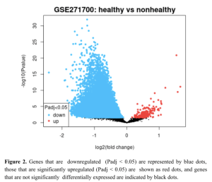GEO2R bioinformatics tool, an interphase between NCBI and GEO was used to identify differentially expressed genes (DEGs.). GEO2R uses R programming language to generate DEG results (R-Script of this research). The GEO2R analysis revealed several genes that are expressed differently between the healthy (non-diabetic) and non-healthy (diabetic) samples as shown in Figure 2. The volcano plot (Figure 2) reveals significant differences in gene expression, with the x-axis representing log2 or fold change and the y-axis displaying -log10 or P Value. Some genes were significantly upregulated (red dots) and others downregulated (blue dots) with Padj < 0.05. These results show differences in gene expression between the healthy and unhealthy samples.