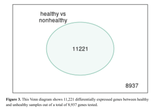 Next, the Venn diagram result (Figure 3) reveals that out of the total number of genes analyzed, 11,221 genes were significantly differentially expressed between healthy and unhealthy (Figure 3). Further, these genes were narrowed down to top 30 DEGs (Supplementary Results: Top 30 DEGs)