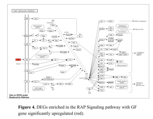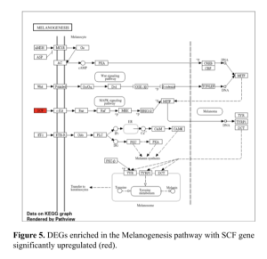 To summarize, the results identified were DEGs between healthy and unhealthy samples. The top DEGs were highly enriched or associated with biological pathways. The Melanogenesis pathway with SCF gene significantly upregulated (red). The RAS signaling pathway with OF gene significantly upregulated (red). Finally the RAPI Signaling pathway with OF gene significantly upregulated (red). These specific genes and pathways involved can be studied further in the lab to help better understand the complexity of the disease and potential cures.