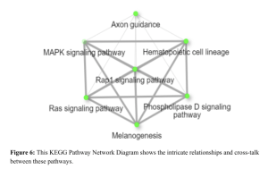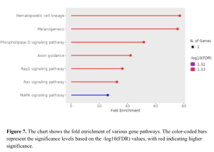 The Pathway Enrichment Analysis (Figure 6) provides assessment of different pathways in our dataset. Hematopoietic cell lineage, Melanogenesis, and Phospholipase D signaling pathway exhibit high fold enrichment, indicating their potential roles in the disease mechanism. The MAPK signaling pathway, though showing a lower fold enrichment, is still significant,