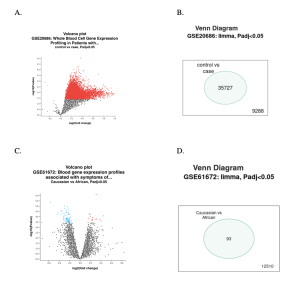 Figure 2 (A, B, D and D) Differentially Expressed Genes. Volcano plot shows genes that are expressed differently between control and case patients, while venn diagram shows the total number of genes from this study and any genes that are expressed differently between control and anxiety samples. In the volcano plots, Figures 2A and 2C, red represents up regulated genes while blue shows down regulated genes. In the venn diagrams, Figures 2B and 2D, the number on the bottom shows the number of genes that are not up/downregulated whereas the number inside the oval shows the number of up/down regulated genes.