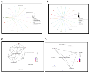 GO analysis showed that the statistically significant pathways of the CHD dataset were ‘positive regulation of endothelial cell apoptotic process’, ‘external side of plasma membrane’, and ‘beta-catenin binding’ (Figure 4A). A significant pathway found in the KEGG analysis was ‘cytokine-cytokine interaction (Figure 4C). In addition, statistically significant genes shown from KEGG analysis included PPP1R17, HSPB1, DCX2, CD40, and CD27 (Figure 3A). GO analysis showed that the statistically significant pathways of the GAD dataset were ‘RNA splicing, via transesterification reaction with bulged adenosine as nucleophile’, ‘spliceosomal complex’, and ‘enzyme inhibitor activity’ (Figure 4B). A significant pathway found in the KEGG analysis was ‘Nucleocytoplasmic transport’ (Figure 4D). In addition, statistically significant genes shown from KEGG analysis included ‘PLCL1’, ‘PEX7’, ‘KMT2C’, ‘ID02’, ‘ATP6V1E1’, ‘NMD3’, ‘NCBP2’, and ‘XPOT’ (Figure 3B). After researching each of the significant pathways and genes, ones that are connected directly to CHD or GAD are shown in the table below in Table 1.