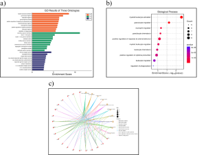 SR Plot was used to complete functional and enrichment analysis to determine the potential functions of the genes. First, it was determined that the GO group with the highest enrichment score, on average, is biological processes (Figure 3a). After analyzing the Dot Plot for biological process, it was determined that myeloid leukocyte activation had the highest enrichment score as well as p-value (Figure 3b). Then, the genes involved with myeloid leukocyte activation were determined using a c-net plot (Figure 3c).