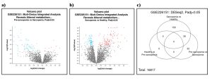 Figure 2: Differentially Expressed Genes. (a) (b)Volcano plots show how the genes are being expressed differently between (a) Pre-sarcopenia and Sarcopenia and (b) Healthy and sarcopenia. The Venn diagram shows the genes that are between pre-sarcopenia, healthy, and sarcopenia patients. Out of 16817 genes that are expressed there is an overlap of genes within the Sarcopenia vs Healthy and Pre-sarcopenia vs Sarcopenia.