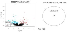 Figure 2: This volcano plot displays upregulated genes (red dots), downregulated genes (blue dots), and similarly expressed genes (black dots) when comparing ADAD and HC groups. This Venn Diagram displays the 136 DEGs between ADAD and HC groups compared to the total of 17264 genes analyzed with GEO2R.