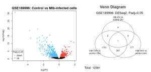 Following figure 1, searching this will provide 396 results and the focus of this study was on result 18 (where 17 was a follow-up, replication study). Then the 124 samples from dataset GSE18999611 was defined or categorized into groups “mtb-2hr” AND “mtb-24hr” AND “mtb-72hr” AND “control-2hr” AND “control-24hr” AND “control-72hr.” They were then analyzed using the no-code GEO2R bioinformatics tool that uses R programming language in order to generate the venn diagram, volcano plot, and list of differentially expressed genes and finally input into SRPlot.
