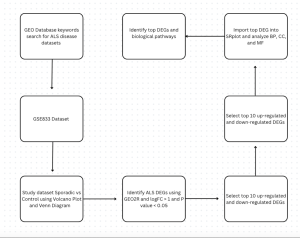 The primary goal of this research is to identify the genes and genetic pathways that are differently expressed in ALS patients compared to healthy individuals. This will help future research in developing genetic tests and preventative measures, potentially leading to earlier interventions and better management of ALS. To achieve this, various bioinformatics tools and databases, such as the National Center for Biotechnology Information (NCBI), GEO2R, and SGplot will be used.