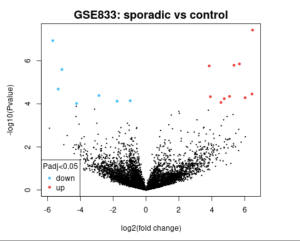 Figure 2. Volcano Plot The image is a volcano plot from a study comparing sporadic cases to a control group, labeled “GSE833: sporadic vs control.” The x-axis represents the log2(fold change), while the y-axis represents the -log10(P value). Significant data points are highlighted in blue (downregulated) and red (upregulated) with an adjusted P value less than 0.05. The central black cluster represents non-significant data points. The plot visually distinguishes genes with significant expression changes between the two groups.