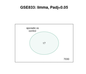 Figure 3. Venn Diagram  image is a Venn diagram from a study comparing gene expression in sporadic ALS cases to a control group, labeled “GSE833: limma, Padj<0.05.” The diagram shows two sets of genes: those in sporadic ALS cases and those in controls. The overlap in the center, containing the number 17, represents the genes that are significantly differentially expressed between the two groups. The number 7030 outside the overlap indicates the total number of genes analyzed in the study. This diagram visually highlights the subset of genes that exhibit significant expression changes in sporadic ALS compared to controls, with an adjusted P value of less than 0.05.