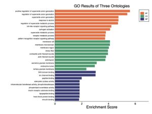 Figure 4. GO results of three ontologies. This bar plot shows the enrichment scores for Gene Ontology (GO) terms across three categories: Biological Process (BP), Cellular Component (CC), and Molecular Function (MF). The most enriched terms include positive regulation of superoxide anion generation, regulation of superoxide metabolic process, and superoxide anion generation in the Biological Process category. The Cellular Component category highlights terms like membrane raft, membrane microdomain, and membrane region. In the Molecular Function category, terms such as SH3 domain binding, ion channel binding, and peptide binding are significantly enriched. Due to these results only biological processes and cellular components will be studied as they are the most enriched.