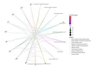 Figure 5. This cnet plot shows the connections between specific genes and their associated biological processes in sporadic ALS patients. The genes with higher log2 fold changes are highlighted in red, indicating their significant upregulation. Genes such as FURIN, LGMN and DRD4 are significantly enriched.