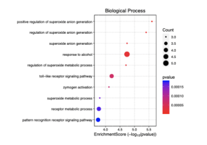 These genes are involved in critical processes such as oxidative stress, immune response, and cellular structure maintenance. Pathways related to superoxide anion generation, pattern recognition receptor signaling, and actin filament organization were highlighted.