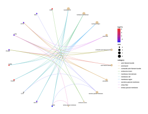 Figure 7: This cnet plot shows the relationships between specific genes and their associated cellular components in sporadic ALS patients. Genes with high log2 fold changes are highlighted in red, portraying significant upregulation. Key genes such as FURIN, LGMN, and CYBA are associated with components like membrane rafts, membrane microdomains, and stress fibers. The size of the nodes represents the significance of the enrichment scores, with larger nodes indicating higher significance. This plot highlights the involvement of various cellular structures in the pathogenesis of ALS.