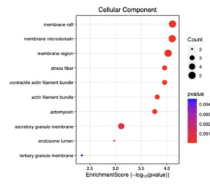 Figure 8: This dotplot shows the enrichment scores of different cellular components in sporadic ALS patients. The x-axis represents the enrichment score (-log10(p-value)), showing the significance of each component. The size of the dots reflects the number of genes (count) involved in each component, while the color gradient represents the p-value, with red indicating lower p-values (higher significance). The three most enriched cellular components are membrane raft, membrane microdomain and membrane region.