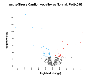 Figure 2a. The volcano plot shows how the genes are being expressed differently between Stress-Induced Cardiomyopathy and healthy individuals. The red dots represent upregulated genes, the blue dots represent down-regulated genes, and the black dots represent an equal amount of expression.