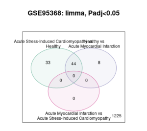Figure 2b. The Venn diagram shows the genes that are shared between Stress-Induced Cardiomyopathy, Acute Myocardial Infarction, and healthy patients. Out of 1225 genes that are expressed there is an overlap of genes within the Stress-Induced Cardiomyopathy vs Healthy group and the Healthy vs Acute Myocardial Infarction group.