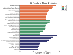 Figure 4a. This image represents the enrichment in all the ontologies from the GO results. BP stands for biological processes, CC stands for cellular components, and MF stands for molecular function. Four pathways were selected based on their high enrichment score. In BP, the maintenance of location and plasma lipoprotein particle organization had high enrichment scores. In MF, the heparin and glycosaminoglycan bindings both had high enrichment scores as well. These processes were further analyzed with the genes due to the fact they had the highest enrichment out of all the results.
