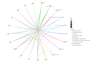 Figure 4b. This is a Cnet plot that shows which genes are related to certain pathways. We are looking for genes that are related to pathways that have a high enrichment score. APOE, F2, and APOB were genes that were related to glycosaminoglycan binding and heparin binding. These genes were specifically selected from other genes also related to glycosaminoglycan binding and heparin binding because they had similarities with the KEGG results.