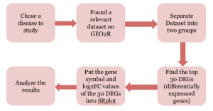 In our study, we started off by finding a dataset in GEO2R, a website that allows you to analyze data from various datasets. After separating the data into two groups; SGLT2i in use and SGLT2i not in use, we could further analyze the dataset. From there, we inserted the list of genes into a sheet and found the top 30 DEGs by sorting the list of genes into the genes with the highest log2FC value and lowest log2FC value.