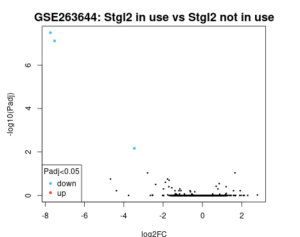 Figure 2B. Volcano Plot More of the genes are upregulated as shown on the graph. The blue dots represent downregulated genes and the black dots represent genes expressed the same in both groups