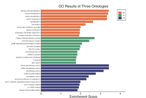 Figure 5. GO Results for BP, CC, MF Histone lysine demethylation, histone demethylation, protein demethylation, protein dealkylation, histone demethylase activity, protein demethylase activity and demethylase activity all have the higher enrichment score.