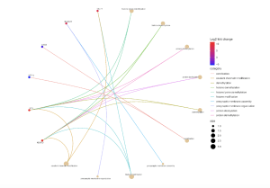 Figure 6. The size of the circles represents how significant they are. The lines connect the dots to show the relationship between genes and their biological function.