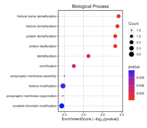 We found that histone lysine demethylation, histone demethylation, protein demethylation, protein dealkylation, histone demethylase activity, protein demethylase activity and demethylase activity have high enrichment scores.