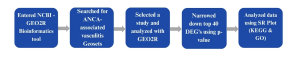 Public gene expression datasets relevant to ANCA-associated vasculitis were retrieved from the Gene Expression Omnibus (GEO) database (8). This dataset included samples from patients diagnosed with AAV as well as healthy controls (GSE129752). To explore gene expression differences between subgroups, patient samples were categorized into endotype A, endotype B, or other, based on prior classification criteria reported in the original studies. This grouping allowed for comparison of gene expression profiles not only between AAV and controls but also among different endotypes of AAV. Differential gene expression analysis was then performed using GEO2R, an online tool offered on the GEO database (8). Figure 1 summarizes the method steps and bioinformatics tools and databases used in this study, from data collection to analysis.
