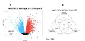 Figure 2: Differentially Expressed Genes- In the volcano plot, red dots represent significantly up-regulated genes, blue dots indicate significantly down-regulated genes, and black dots show genes with no significant expression difference between the two groups. Many genes were upregulated, although a substantial number were also downregulated. In the Venn Diagram, out of 16,280 total genes, 3,088 overlapped between Endotypes A and B, with 230 genes shared across all samples.