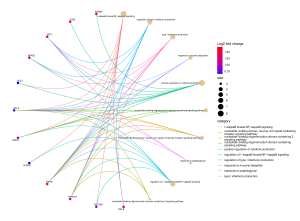 Figure 5 BP cnetplot: This cnetplot displays significant genes and the categories they are connected to. The most significant genes are shown in bright red, which represents a high Log2 fold change (Log2fc). The top genes in this plot are CD83 and RIPK2.