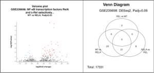 Bioinformatics tools NCBI GEO2R and SRplot for GO and KEGG analysis were used to study dataset GSE239698. Groups included RELA (RelA-deficient), REL (Rel-deficient), and WT (wild-type, normal). GEO2R was used to identify differentially expressed genes (DEGs), which were further analyzed with SRPlot for GO and KEGG pathway enrichment.