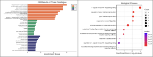 Figure 4. GO Analysis: A. The Go Results of Three Ontologies bar graph displays three ontologies and their enrichment within the genes analyzed. Orange represents Biological Processes (BP), green represents Cellular Components (CC), and blue represents Molecular Functions (MF). The BP ontology is significantly more enriched than CC and MF. The most enriched result in BP was the I-kappaB kinase (IKK) pathway. B. The Biological Processes dot plot shows the enrichment score, p-value, and count for each biological process. The top biological process identified is the I-kappaB kinase (IKK) pathway.