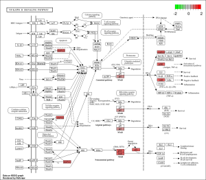 Figure 3. KEGG Results NF-KAPPA B signaling pathway: In this graph, green represents low significance, while red represents high significance in the pathway. The most significant genes in this pathway were identified as cIAP1 and cIAP2 (cIAP1/2).
