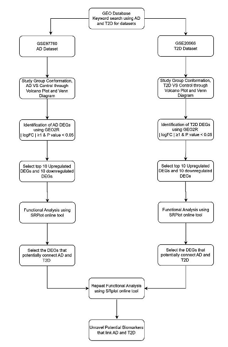 To investigate potential genetic or molecular biomarkers that are shared between Alzheimer’s disease (AD) and Type 2 Diabetes mellitus (T2D), this research used different Bioinformatics tools and databases. The method workflow is shown in Figure 1. First, I navigated through the extensive Gene Expression Omnibus (GEO) bioinformatics tool within NCBI, which contains genetic information contributed by different researchers worldwide (Edgar et al., 2002).