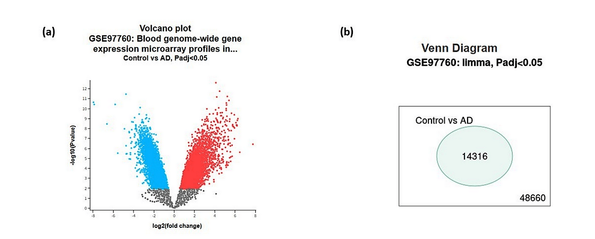 Figure 2: Microarray differential gene analysis in the AD group (a) The Volcano Plot of the genes between AD and controls: red and blue indicate upregulation and downregulation, respectively (b) Venn Diagram of AD and control group.