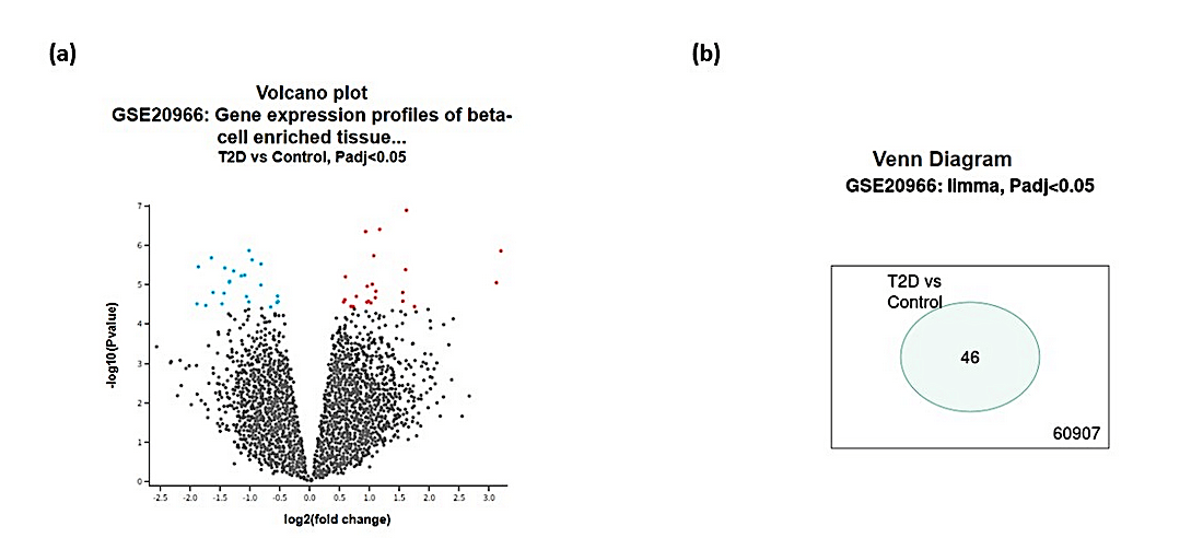 The same process was repeated for the T2D dataset GSE20966, where DEGs were identified (Figure 3). This dataset contained gene expression profiles derived from beta-cell enriched tissue obtained through Laser Capture Microdissection from individuals with type 2 diabetes (Marselli et al, 2010). Using GEO2R Bioinformatics tool, we identified the DEGs from this dataset (Figure 3) and statistical analyses were used to select a total of 20 DEGs, including 10 up-regulated DEGs and 10 down-regulated DEGs, were chosen between T2D and healthy controls (Supplementary data). Figure 3a and 3b shows the volcano plot and venn diagram of the genes between T2D and control samples. The upregulated genes are indicated in red color in the volcano plot, while the down-regulated genes are shown in blue color. Black color in the volcano plot indicates non-significant genes.