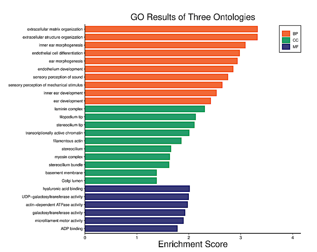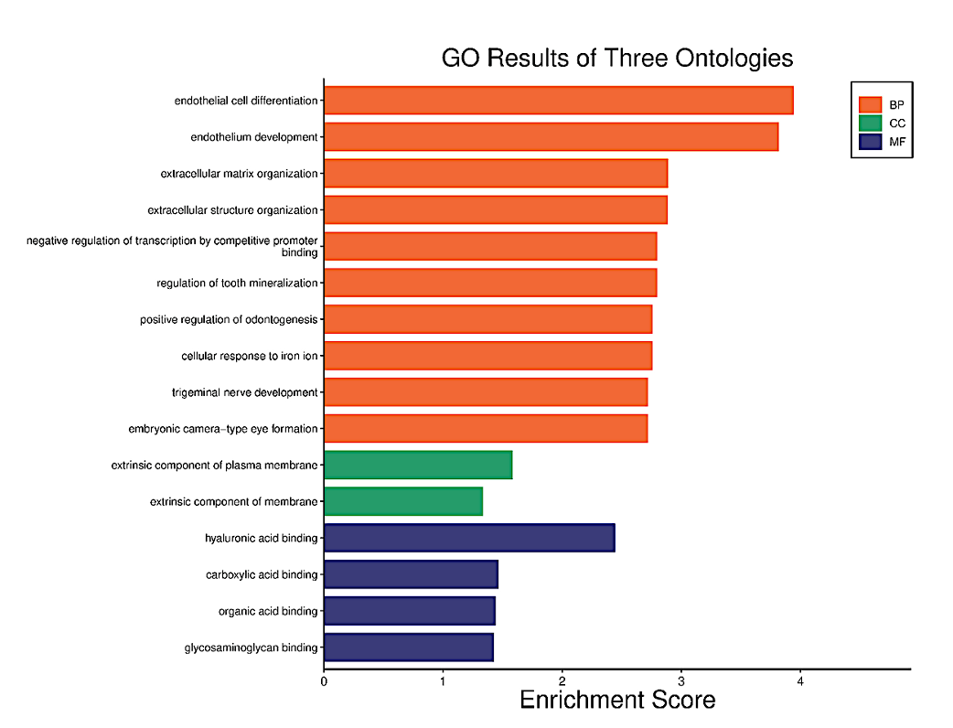 A repeat GO and KEGG Analysis were performed for the selected AD and T2D DEGs. AD GO analysis results (Figure 6) show the three ontologies (Figure 6a), biological process (BP) (Figure 6b), which contains extracellular matrix organization, endothelial cell differentiation, endothelium development; cellular components (CC) (Figure S3a), which involved extrinsic component of plasma membrane, Extrinsic component of membrane; molecular functions (MF) (Figure S3b), such as hyaluronic acid binding, carboxylic acid binding and organic acid binding. There were no KEGG Pathway results for these DEGs.