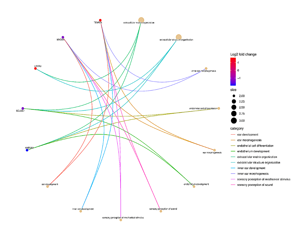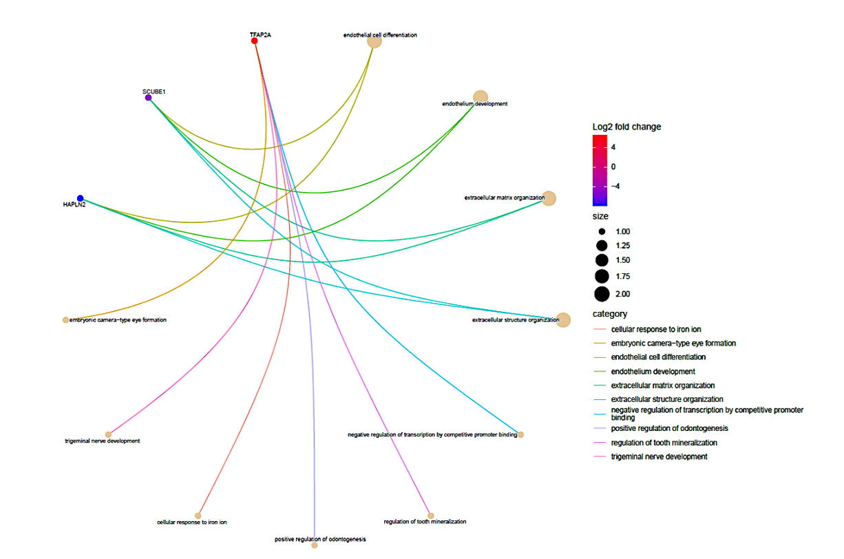 Figure 4b. Functional characteristics analysis for the AD-related DEGs: The Biological Process (BP) category of GO enrichment analysis. The nodes (dots) at the tip of the lines indicate genes. Genes with high log2 fold change are red while those with the lowest log2 fold change are blue in color.