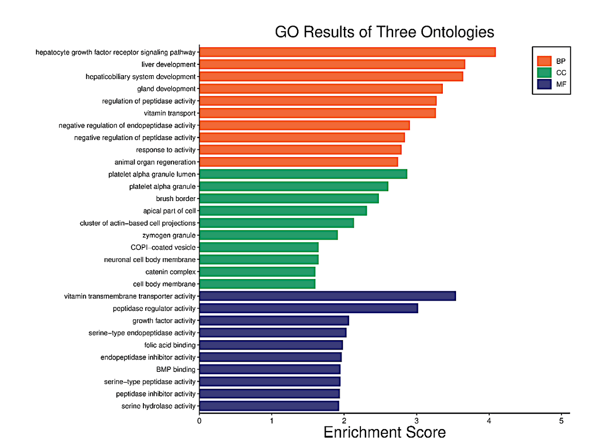 T2D GO analysis results show the three ontologies (Figure 5a), biological process (BP) (Figure 5b), which contains hepatocyte growth factor receptor signaling pathway, liver development, hepatobiliary system development; cellular components (CC) (Figure S2a), which involved platelet alpha granule, brush border, apical part of cell; molecular functions (MF) (Figure S2b), such as vitamin transmembrane transporter activity, peptidase regulator activity and growth factor activity. KEGG Pathway (Figure 5c, and Figure S2c) included Glucagon Signaling Pathway, Insulin resistance and Focal adhesion.