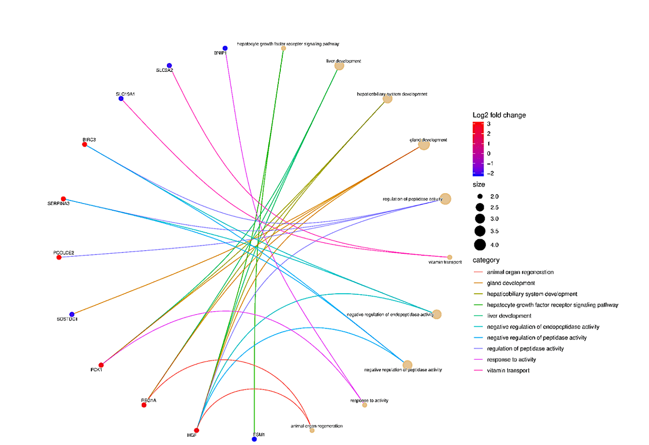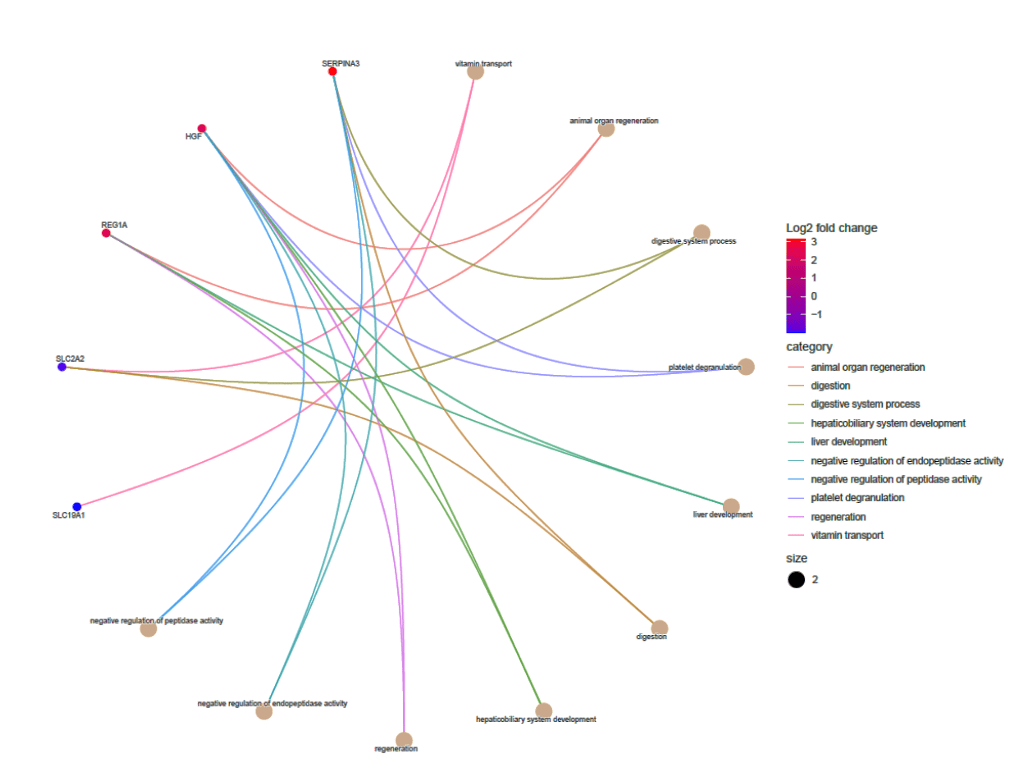Figure 5b. Functional characteristics analysis for the T2D-related DEGs: The Biological Process (BP) category of GO enrichment analysis. The nodes (dots) at the tip of the lines indicate genes. Genes with high log2 fold change are red while those with the lowest log2 fold change are blue in color.
