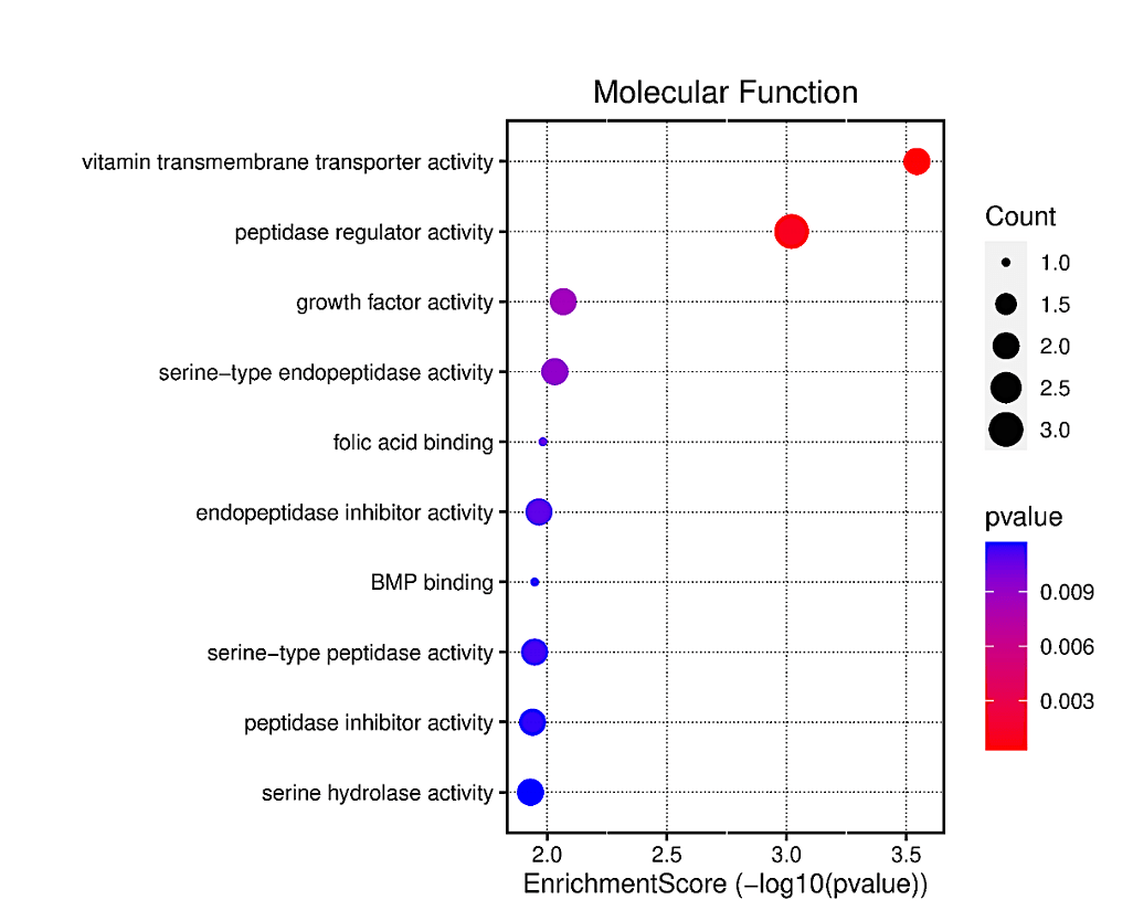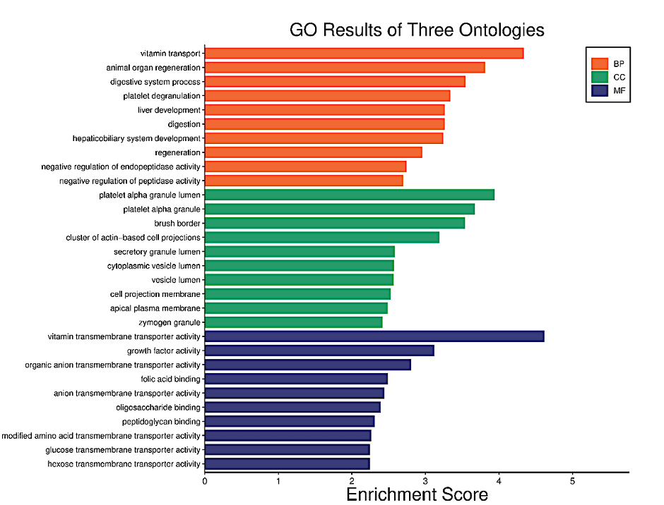T2D GO analysis results show the three ontologies (Figure 7a), biological process (BP) (Figure 7b), which contains vitamin transport, animal organ regeneration, digestive system process; cellular components (CC) (Figure S4a), which involved platelet alpha granule, platelet alpha granule lumen, brush border; molecular functions (MF) (Figure S4b), such as vitamin transmembrane transporter activity, growth factor activity and organic anion transmembrane transporter activity. KEGG Pathway (Figure S4c and S4d) included vitamin digestion and absorption, maturity onset diabetes of the young and Antifolate resistance. Among the significant enrichment pathways were the renal cell carcinoma and prolactin signaling pathways which indicate the potential connection between T2D and AD.