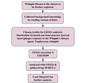 This research utilized bioinformatics databases from the National Center for Biotechnology Information (NCBI), the  GEO2R tool (NCBI, “GEO2R”). The dataset being used was focused on a primary study that analyzed gene expression changes in response to T. whipplei infection using affected macrophages from bone marrow. The accession number for this dataset is #GSE20209. The primary research involved a whole genome microarray analysis of interleukin-16-knock-out bone-marrow-derived macrophages, examining how gene expression was altered after a 6-hour exposure to the bacteria (GEO2R, 2010). Distinct gene expression patterns differentiated infected samples from uninfected ones and validated these findings using real-time PCR on the same RNA samples.