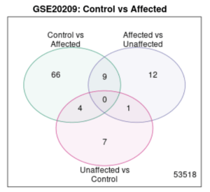 Figure 3. Venn Diagram. Within a total of 53518 genes, there were no common genes expressed in both groups, when taking “unaffected” into account, however, there is some regional overlapping between any two given groups.