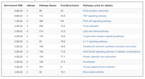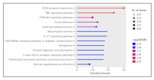 Figure 4. Enrichment Chart. In this chart, fold enrichment was taken into consideration among all factors for measurement of how significant the pathways are. Fold Enrichment measures the magnitude of enrichment. Higher values indicate stronger enrichment and are an important metric of effect size. As shown, the ECM-receptor interaction and TNF signaling pathway have the highest enrichment scores with 30 and 23.6, respectively indicating their significance.