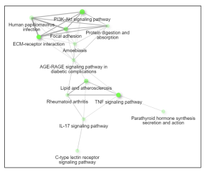 A total of 53518 DEGs were identified upon analysis. As shown in Figure 1, there seemed to be more upregulated genes than downregulated ones. The top 8 GO terms upon enrichment using ShinyGO include ECM-receptor interaction, TNF signaling pathway, Rheumatoid arthritis, IL-17 signaling pathway, AGE-RAGE signaling pathway in diabetic complications, Amoebiasis, Protein digestion and absorption, and C-type lectin receptor signaling pathway.